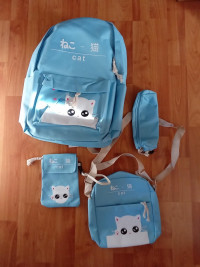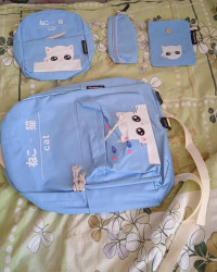 Школьный рюкзак для девочек, вместе с тем - набор из 4 предметов, в который кроме рюкзака входят ещё и пенал, кошелёк и сумочка. Полная школьная экипировка, которую можно использовать в качестве повседневного рюкзака для города и вылазок на природу. С таким рюкзаком можно совершать пробежки, поскольку он изготовлен из нейлона, что делает изделие особенно мягким и нежным. Дополнительное удобство создадут и мягкие настраиваемые по фигуре лямки. Несмотря на то, что это детский комплект - его возрастной диапазон существенно расширен. В основном из-за его ненавязчивого дизайна. На кармашке изображен милый котёнок, который понравится детям, но не является именно детским атрибутом. Все застёжки - молнии, а вместимость достигает 16 л, что вполне достаточный объём для переноски не только учебников, но и спортивной формы. Такой рюкзак станет превосходным подарком, который будет вполне уместен в честь любого праздника и к началу нового учебного года.
