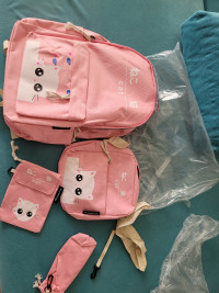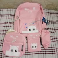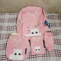 Школьный рюкзак для девочек, вместе с тем - набор из 4 предметов, в который кроме рюкзака входят ещё и пенал, кошелёк и сумочка. Полная школьная экипировка, которую можно использовать в качестве повседневного рюкзака для города и вылазок на природу. С таким рюкзаком можно совершать пробежки, поскольку он изготовлен из нейлона, что делает изделие особенно мягким и нежным. Дополнительное удобство создадут и мягкие настраиваемые по фигуре лямки. Несмотря на то, что это детский комплект - его возрастной диапазон существенно расширен. В основном из-за его ненавязчивого дизайна. На кармашке изображен милый котёнок, который понравится детям, но не является именно детским атрибутом. Все застёжки - молнии, а вместимость достигает 16 л, что вполне достаточный объём для переноски не только учебников, но и спортивной формы. Такой рюкзак станет превосходным подарком, который будет вполне уместен в честь любого праздника и к началу нового учебного года.