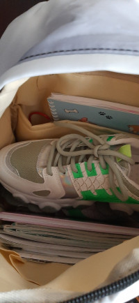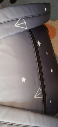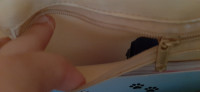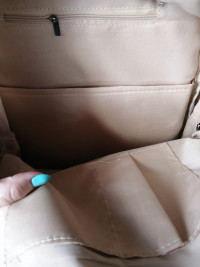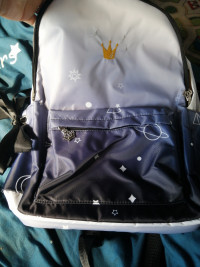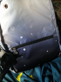 Имеется один боковой карман, внутри одно большое отделение и два маленьких отдела для тетрадей и канцелярских принадлежностей